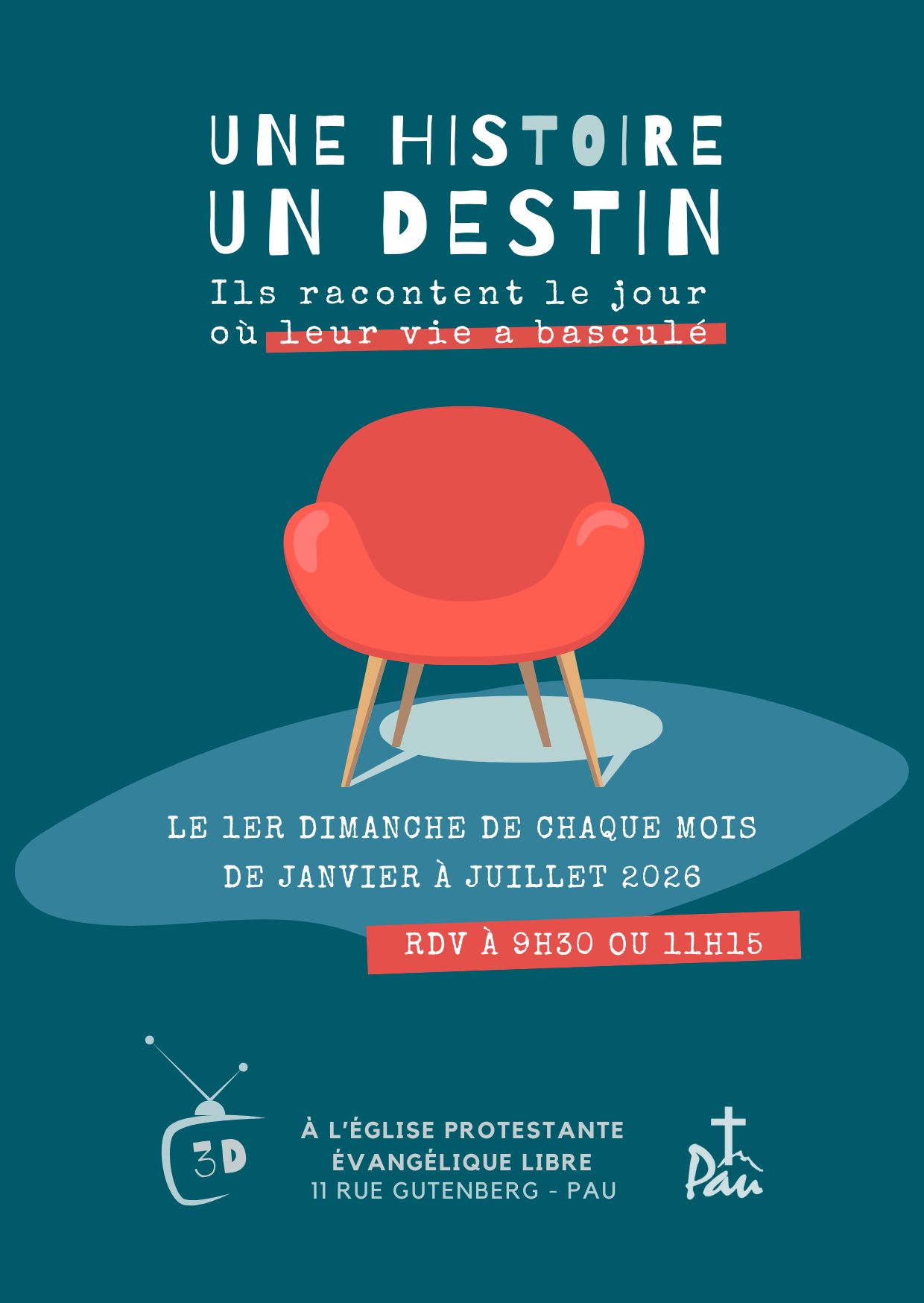 Deux cultes identiques le dimanche à 9h30 et 11h15 au 11 rue Gutenberg à Pau (voir arrêts de bus ci-dessous).